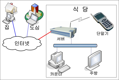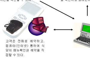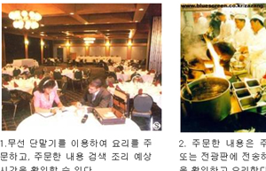 | 현재 일반식당에서는 주문을 받을 때 종이를 사용하여 기록하고 카운터에 제출하면 카운터에서는 주 방으로 주문하는 번거로움이 있으며, 영업이 끝난 후 결산하는 데에도 많은 시간이 소요된다. 이러한 과정을 무선단말기에 손님이 요구하는 내용을 입력하면, 주문과 동시에 무선으로 카운터의 컴퓨터와 주방전광판 또는, 모니터에 데이터를 전송한다. 카운터에 있는 컴퓨터는 주문현황을 분석 및 주문한 요리가 나올 시간을 예측하여 무선 단말기로 전송하며, 입력된 내용을 계산하고, 현재의 매출현황과 일별, 월별 데이터를 관리한다.또한 인터넷을 통하여 예약 서비스 등 고객들에게 다양한 서비스들 제공하고, 관리자는 외부에서 현재식당의 운영 상태를 확인·관리할 수 있는 시스템이다. |
